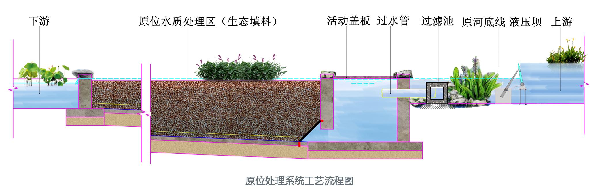 主要利用河道的河床,在河床下建設(shè)處理單元。在不降低行洪標(biāo)準(zhǔn)的前提下,通過自動控制的壩體調(diào)整河道水位高差,將污染水引入水下處理單元,采用具有針對性的脫氮除磷強化填料做基質(zhì),對水質(zhì)進行凈化。用于周邊土地資源緊張的城市河道治理。